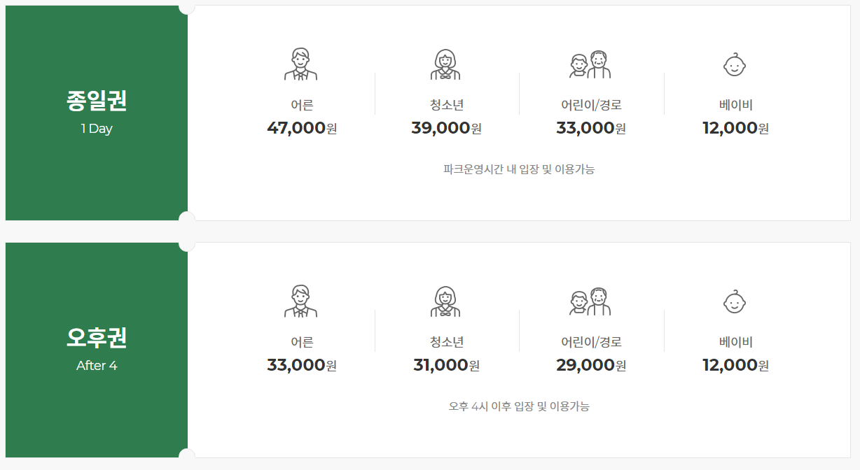 그린등급의 가격은 어른 18만원, 어린이는 14만원, 베이비는 9만원입니다. 입장 이외에 주차 혜택 등은 제공되지 않네요.
