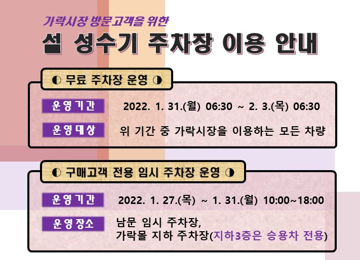 1월 31일(월) 6:30 ~ 2월 3일(목) 6:30 까지 가락시장 이용시 주차는 '무료'입니다.