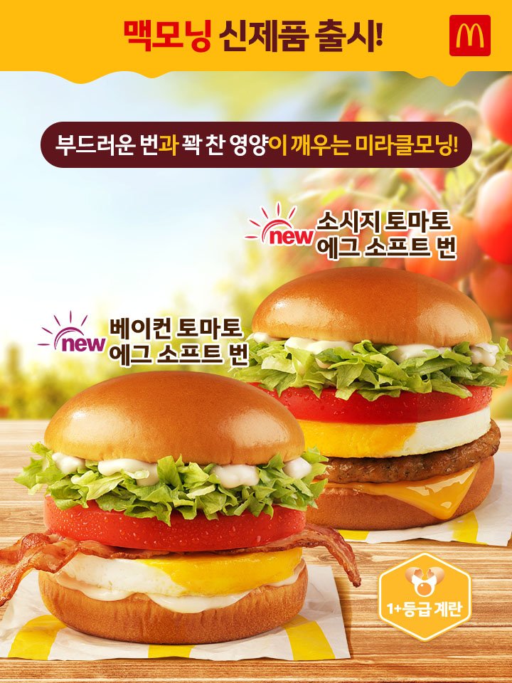 맥모닝 신제품이 출시되었습니다. 베이컨 토마토 에그 소프트번과 소시지 토마토 에그 소프트번이 그 주인공입니다. 스팀 번이어서 촉촉한 맛이 좋다고 합니다.