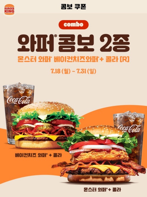 무료 세트업 말고도 버거 가격에 음료를 얹어 주는 콤보 쿠폰 행사도 있습니다. 와퍼 콤보 2종 쿠폰도 있으니까 베이컨치즈 와퍼 또는 몬스터 와퍼를 드시는 분이라면 와퍼 콤보 받아서 이용해 보세요.