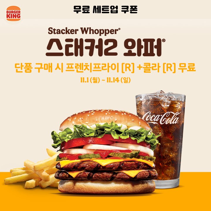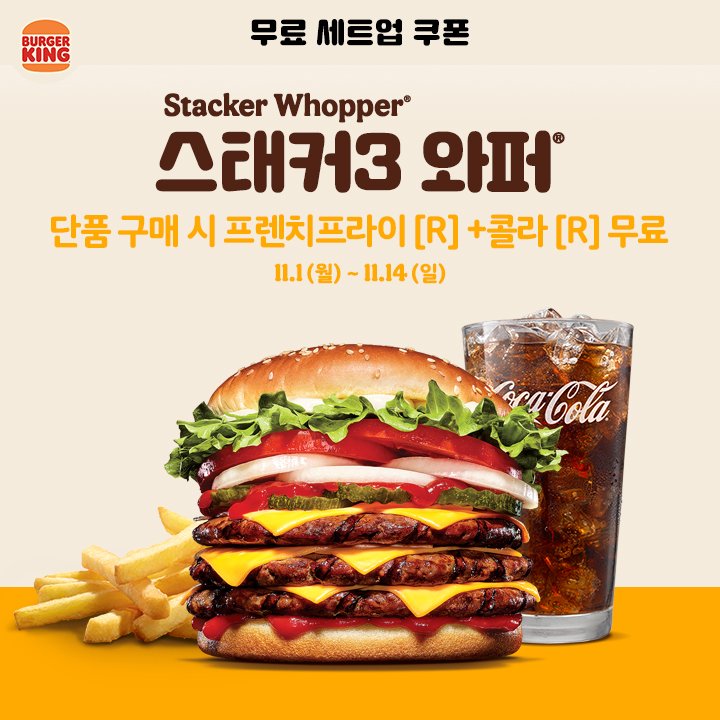 11월 14일(일)까지는 스태커2 와퍼와 스태커3 와퍼도 무료 세트업 쿠폰을 사용할 수 있습니다. 이것도 어떻게 받는다? 바로 버거킹 카톡 플친을 추가해서 받는 것입니다.