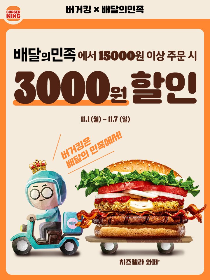 마지막으로 배민으로 버거킹을 15000원 이상 주문하면 3000원 할인해 줍니다. 최소 금액만 맞춰 주문하는게 가장 이득인 것은 아시나요? 롯데리아에서는 매장가격과 딜리버리 가격을 통일하고 대신에 배달팁을 받는 것으로 바꾸었죠.