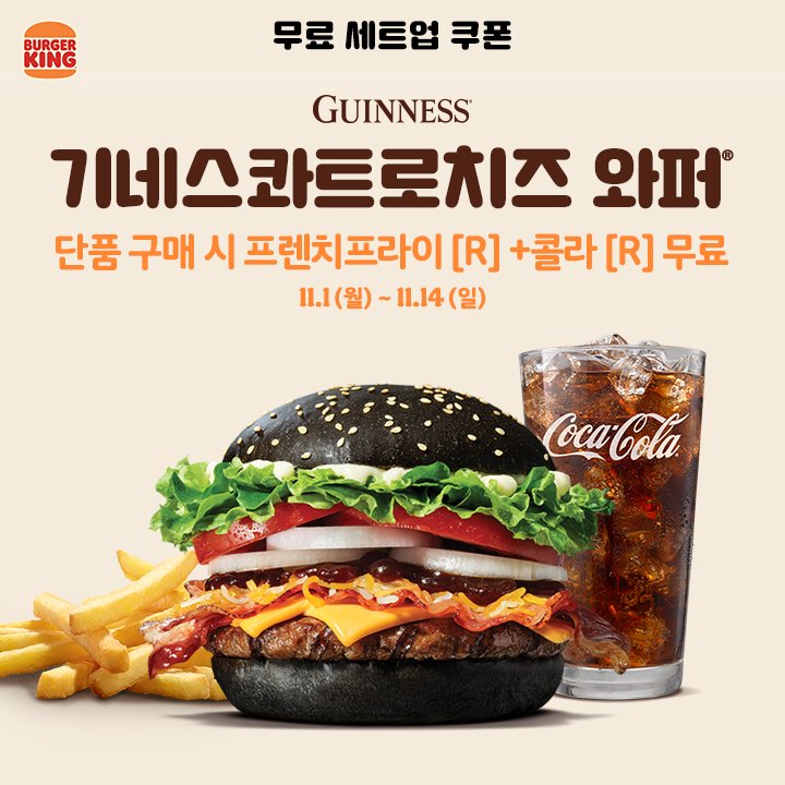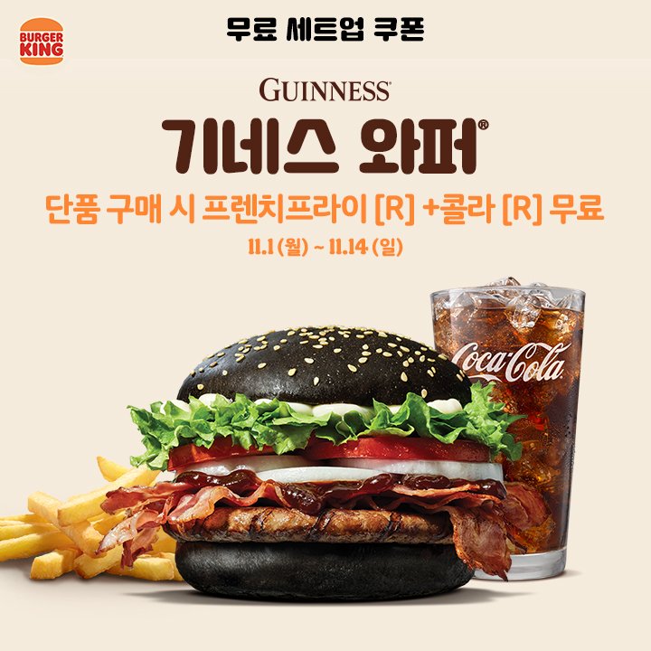 기네스 와퍼, 기네스콰트로치즈 와퍼, 기네스머쉬룸 와퍼에 대해서는 무료 세트업 쿠폰을 나눠주고 있습니다. 어디서요? 바로 버거킹 카카오톡 플러스친구 추가를 하면 바로 받으실 수 있습니다.