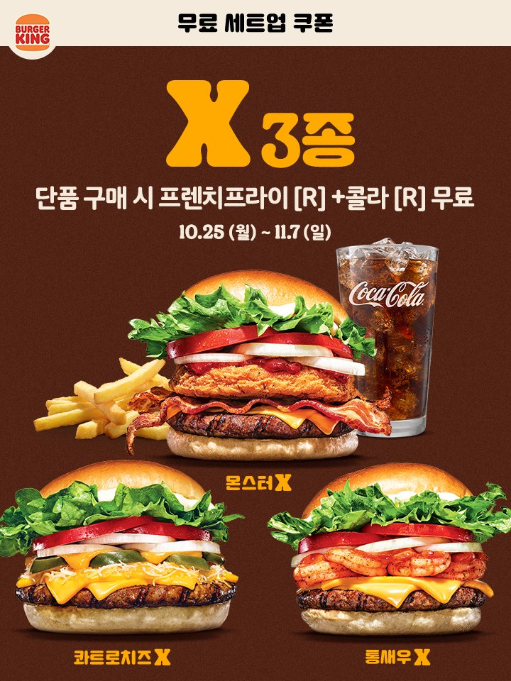 또한 몬스터X, 콰트로치트X, 통새우X 이렇게 3개의 스테이크 패티를 사용한 버거도 무료 세트업 쿠폰을 받을 수 있어요. 이 쿠폰은 지난주부터 뿌리던 것이어서 유효기간은 11월 7일(일)까지입니다.