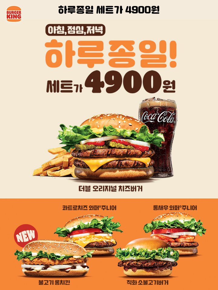 버거킹의 사딸라 메뉴, 올데이킹 메뉴들을 즐겨보라고 강조하고 있네요. 더블 오리지널 치즈버거는 저 세트가 단돈 4900원 밖에 안한다는게 안 믿길 정도의 고퀄리티 버거에요. 생각보다 괜찮습니다.