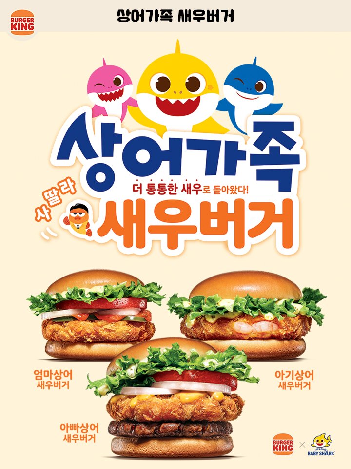 통통한 새우가 그대로 들어가 있는 상어가족 새우버거도 열심히 광고를 하고 있습니다. 아빠상어 새우버거는 새우패티와 고기 패티가 곁들여진거고, 엄마 상어는 새우패티에 와퍼와 마찬가지로 토마토, 양파 등의 야채가 듬뿍 들어간 버거에요. 아기상어 새우버거는 엄마한테서 토마토, 양파 등 일부 야채를 빼고 새우패티에 집중할 수 있는 버거입니다.