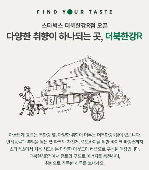 이곳은 서울과 춘천을 잇는 북한강 자전거길 바로 옆에 위치해 있는 곳입니다. 그래서 자전거와 오토바이를 위한 바이크 파킹존도 보유하고 있습니다. 스타벅스에서 처음 시도하는 아웃도어 컨셉의 매장이죠.