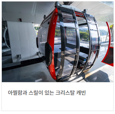 케이블카는 크리스탈 캐빈과 일반 캐빈 2가지 종류가 있습니다. 크리스탈은 바닥이 유리로 되어 있어서 아래를 시원하게 볼 수 있는 것이고, 일반은 바닥이 막혀 있는 일반적인 캐빈이에요.