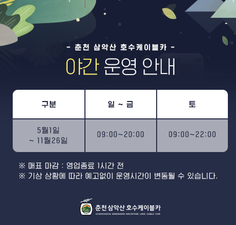 또한, 삼악산 스카이워크 산책길도 개장을 해서 함께 이용할 수 있는 상태입니다. 삼악산 스카이워크 산책길은 토요일에만 오전 9시부터 밤 9시까지 운영하고, 나머지 요일은 오전 9시부터 저녁 7시까지만 운영합니다.