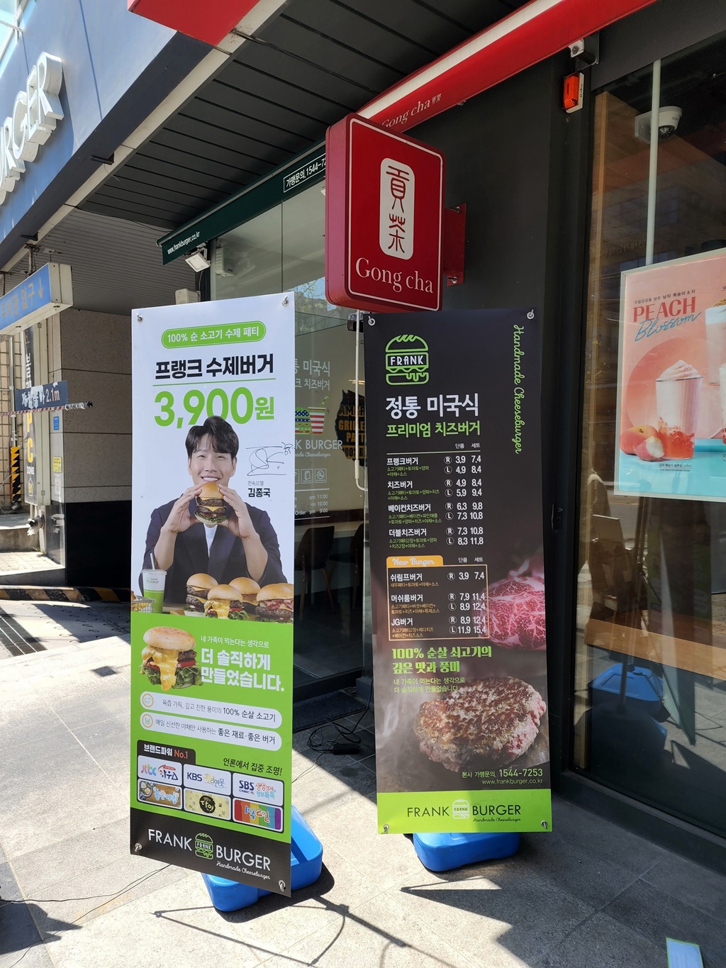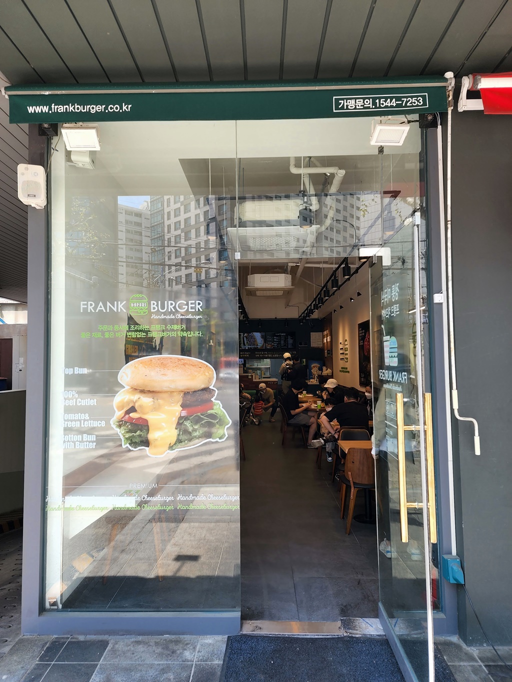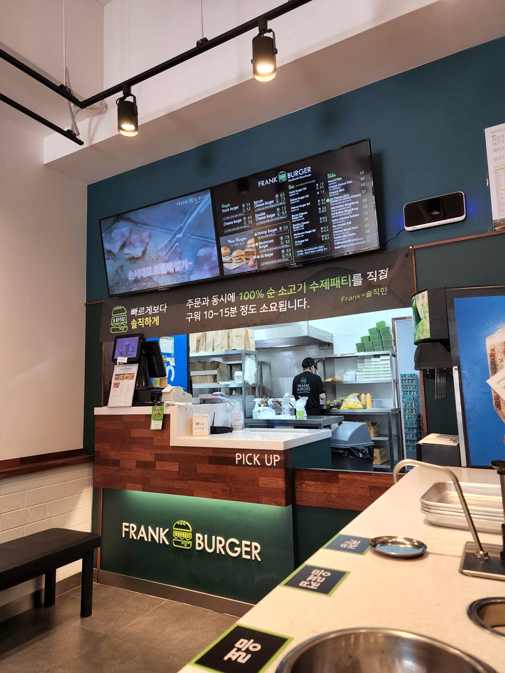 프랭크버거의 모델은 원래 태권도 묘기를 보여주면서도 노래를 잘 하는 나태주였는데, 김종국으로 바뀐지 좀 되었다. 라면도 안 먹는 것으로 알고 있는데, 김종국이 버거는 먹는지 조금 궁금하기는 하다. 프랭크버거는 대형 프랜차이즈는 아니기 때문에 매장 사이즈가 그리 크지 않은 편이다.