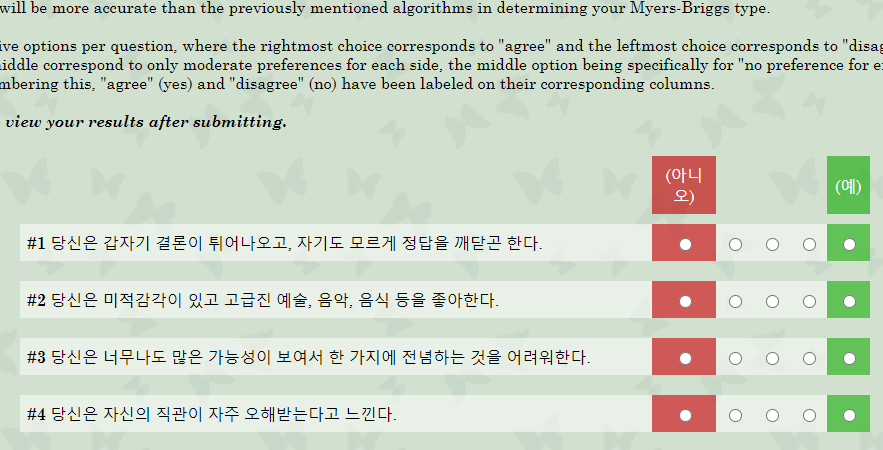 두 번째 MBTI 무료 테스트 링크는 sakinorva 사이트입니다. 이곳은 앞에서 언급한 곳보다 조금 미적 감각이 덜하기는 하지만 한 페이지에서 문항을 다 볼 수 있어서 응답하기 조금 더 편합니다.