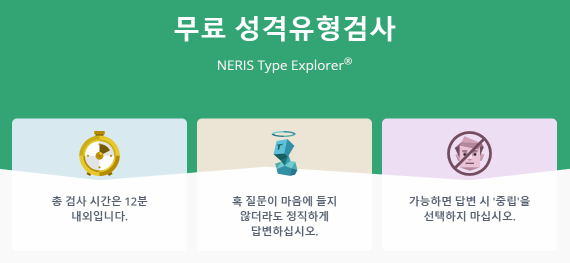 총 검사 시간은 12분 내외입니다. 질문을 보고 가장 먼저 마음 속에 떠오른 답을 고르시되, 가능한 중립을 고르지 않는 것을 추천한다고 합니다. 중립이 많이 선택되면 애매한 답이 나옵니다.